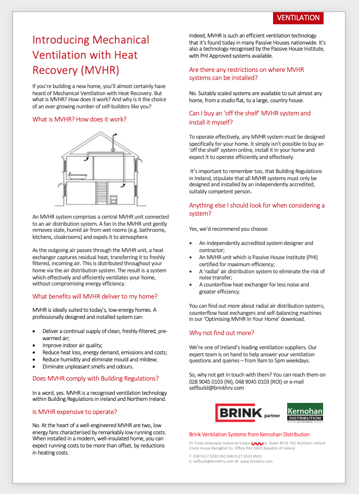 If your architect or contractor is unfamiliar with mechanical ventilation with heat recovery, we also offer free, independently certified, CIBSE, Engineers Ireland, RIAI and RIBA accredited CPD courses for construction industry professionals too.